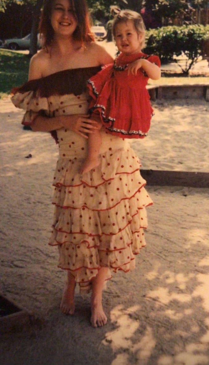 At that time my hair was very long and red. It was my crowning glory. I have a photo of me, in a white and red polka dot flamenco dress that I bought at a yard sale from an aged dancer, who danced in Spain. Bethezda, my eccentric neighbor, lived on the other downside apartment of the house, with her son Mars. She had given us a tiny vintage red dress, as well, that my daughter wore in the photo. My first real love of my life, the boyfriend I met a few months after moving in the house, took the photo of us. It probably was the peak of my attractiveness.